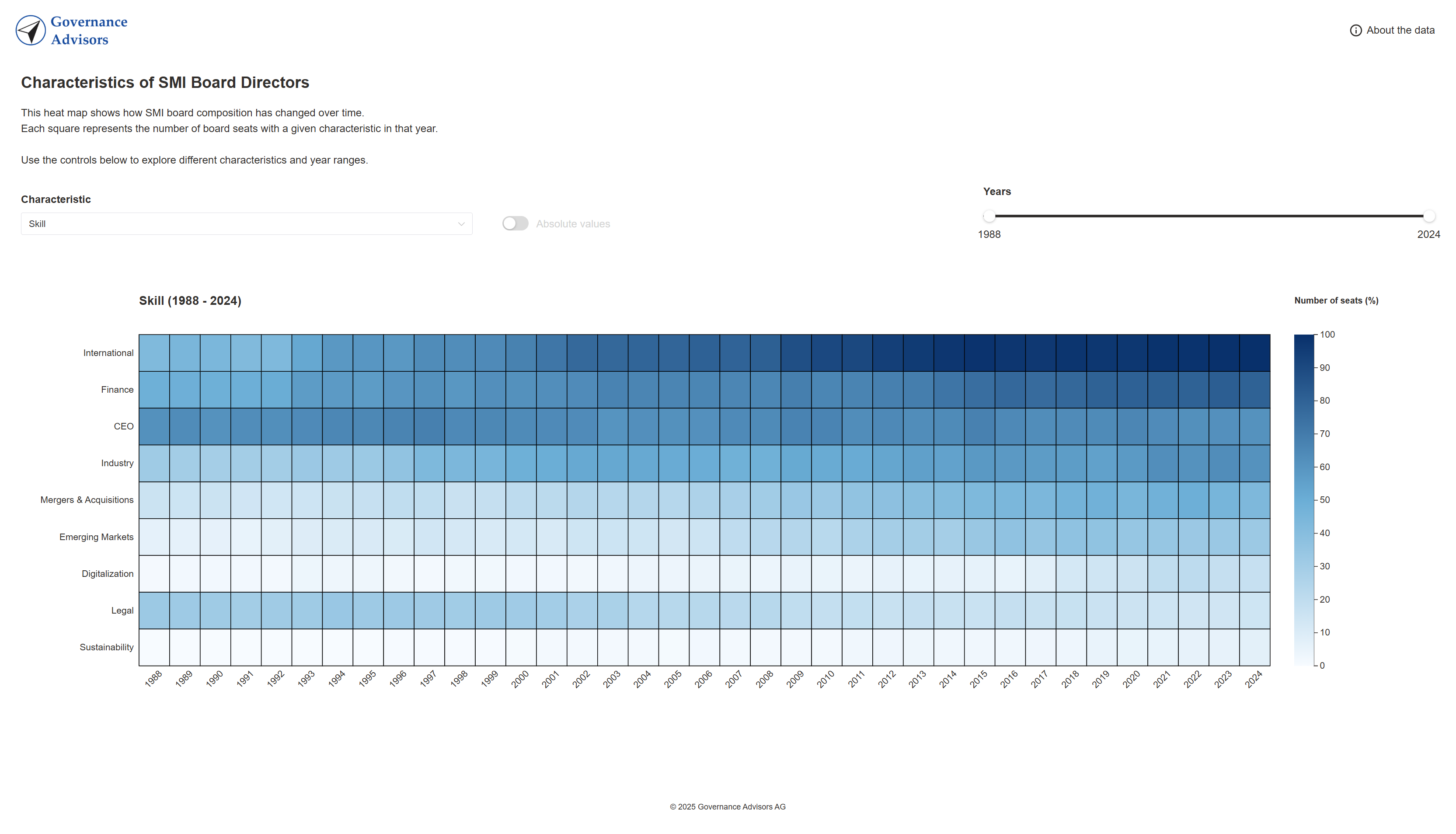 The dynamic visualization shows the distribution of seats for members of the Swiss parliament in relation to an additional feature.